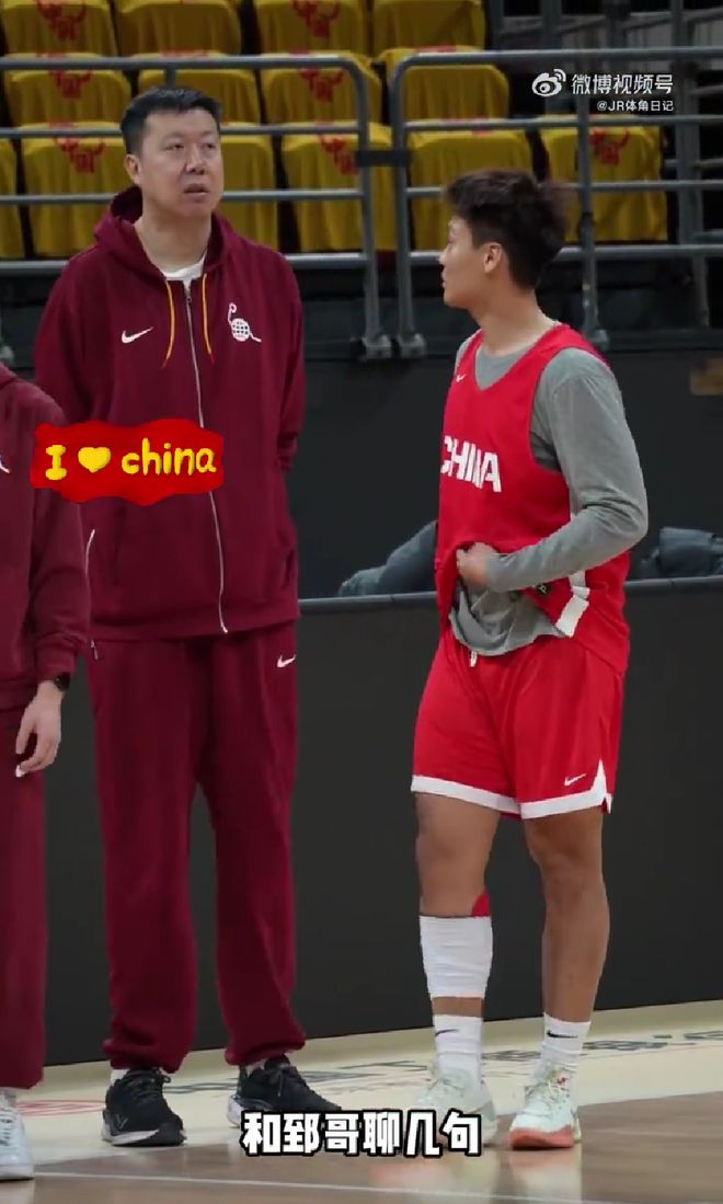 赵睿和教练组成员王治郅进行了简单的交流,并且进行了简单的投篮训练。