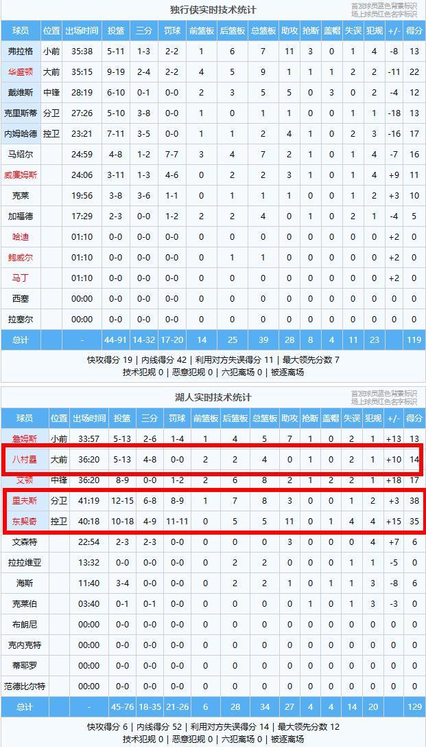 里夫斯38分8板3助、东契奇35分5板11助、艾顿17分8板2助2帽、八村塁14分4板、詹姆斯13分5板7助、海斯6分2板1助、文森特6分3助、拉拉维亚2板