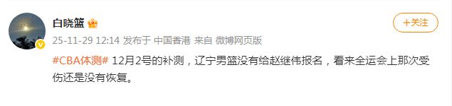 赵继伟因伤缺席了新赛季的CBA体测,且为了保险起见,根据媒体人白晓篮报道:“12月2号的补测,辽宁男篮没有给赵继伟报名,看来全运会上那次受伤还是没有恢复。”