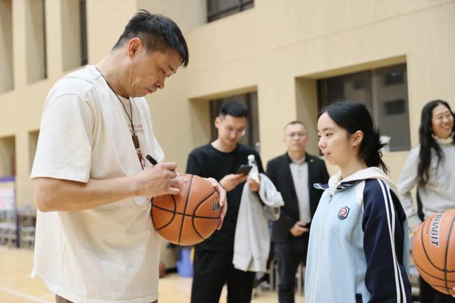 在互动交流环节,张劲松为孩子们在篮球上签名留念。他表示,青少年们可以从体育锻炼中汲取营养,对体育的热爱可以相伴终身,无论科技如何发展,运动员的精神不可替代。