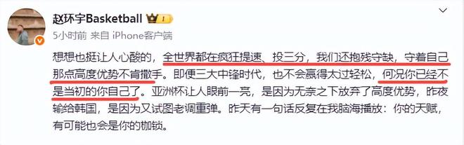 而赵宇环的批评更严厉:全世界都在疯狂提速、投三分,我们还抱残守缺,守着自己那点高度优势不肯撒手。即便三大中锋时代,也不会赢得太过轻松,何况你已经不是当初的你自己了。
