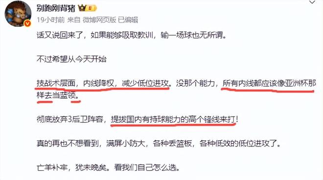 别跑背刚猪说,在技战术层面,内线降权,减少低位进攻。没那个能力,所有内线都应该像亚洲杯那样去当蓝领。
