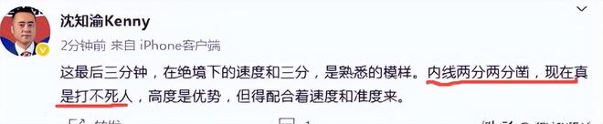 名嘴沈知渝点评道:内线两分两分凿,现在真是打不死人,高度是优势,但得配合着速度和准度来。