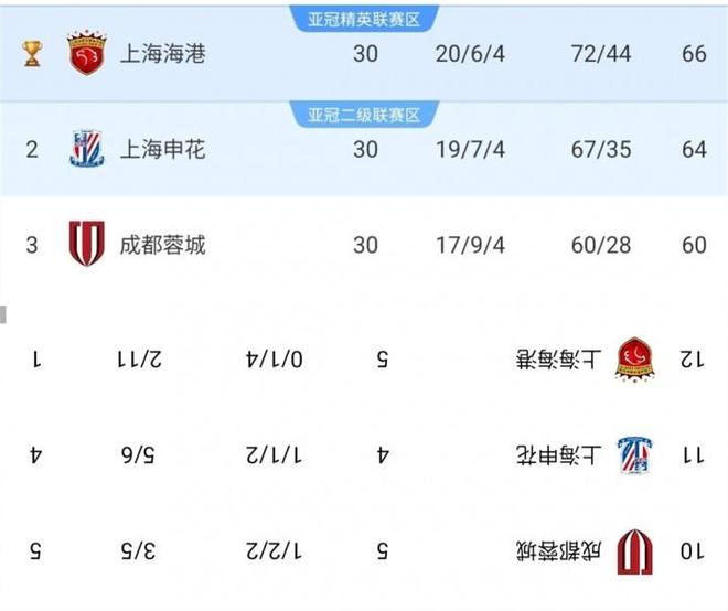 有人弄了一个中超和亚冠倒转榜(上图)。这一转就看出门道:中超是海港第一,申花第二,成都蓉城第三;到了亚冠这排名则倒转过来:成都蓉城5分第一,申花4分第二,海港1分排名第三