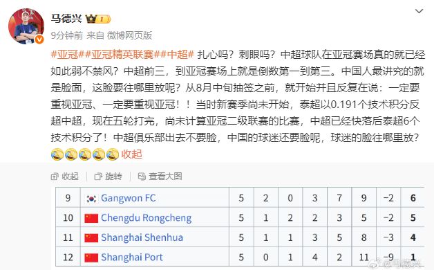 “从8月中旬抽签之前,就开始并且反复在说:一定要重视亚冠、一定要重视亚冠!!当时新赛季尚未开始,泰超以0.191个技术积分反超中超,现在五轮打完,尚未计算亚冠二级联赛的比赛,中超已经快落后泰超6个技术积分了!中超俱乐部出去不要脸,中国的球迷还要脸呢,球迷的脸往哪里放?